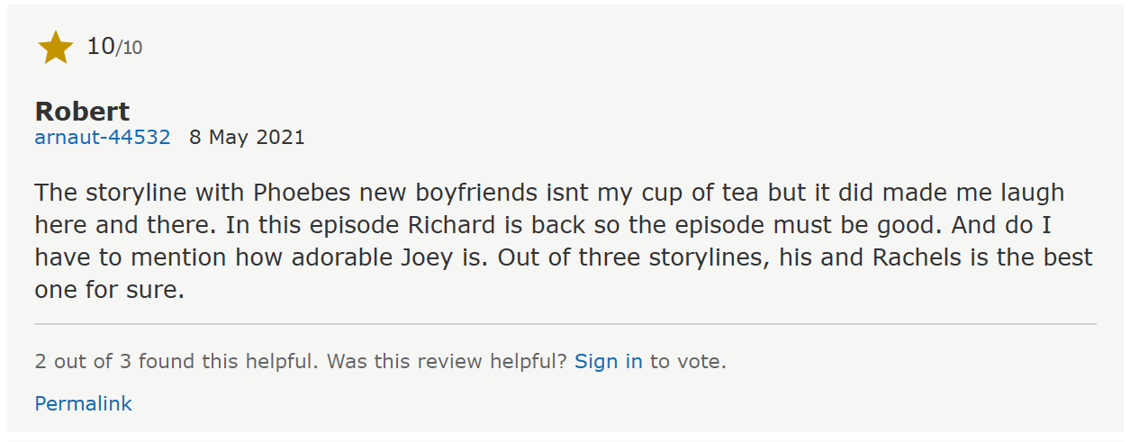 모니카는 비디오 가게에서 우연히 리처드를 만나고 시시콜콜 이야기를 주고 받다가 다시 만남을 이어가게 됩니다. 피비가 데려온 남자친구는 캘리포니아 출신으로 짧은 반바지를 즐겨입는데, 바지 안에 속옷을 착용하지 않는게 문제였습니다. 커피하우스에서 친구들은 차례대로 그의 바짓속을 보게 되고, 대체 그에게 어떻게 얘기해주어야 할 지 피비는 난감해 합니다. 마침내 그에게 사실대로 털어놓으려던 찰나 건터도 그의 노팬티를 발견하고 그에게 주의를 줍니다. 조이는 샤이닝을 읽다가 무서운 부분이 나온다며 냉동고에 넣어두고, 이를 발견한 레이첼과 책 이야기를 하다가 작은 아씨들을 읽게 됩니다. 두 사람은 각자가 추천한 책에 빠져서 행복한 시간을 보내지만, 곧이어 스포일러 해버린 조이로 인해 신경전이 벌어집니다.