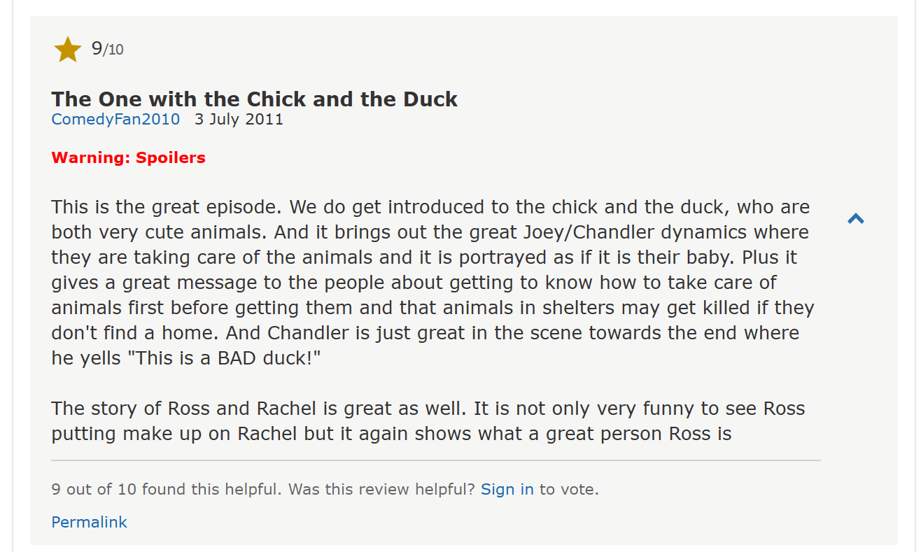 *처음에 조이가 병아리를 데려오고 그 다음에 보호소에서 챈들러가 오리를 데려온 거군요. 정주행 8번만에 겨우 인식을 했습니다. 챈들러가 오리를 데려온 사연을 들어보면 그가 얼마나 정이 많고 자상한 사람인지 알 수 있습니다. 한편 로스가 전 여자친구 레이첼에게 벗은 모습을 얼마든지 상상할 수 있다면서 장난치는 모습은 좀 불편했습니다. 그러면서 레이첼에게 철 좀 들으라고 하는데, 글쎄요 두 사람이 좋다면 그걸로 된거지만 보는 사람 입장에서는 좀 별로였습니다.