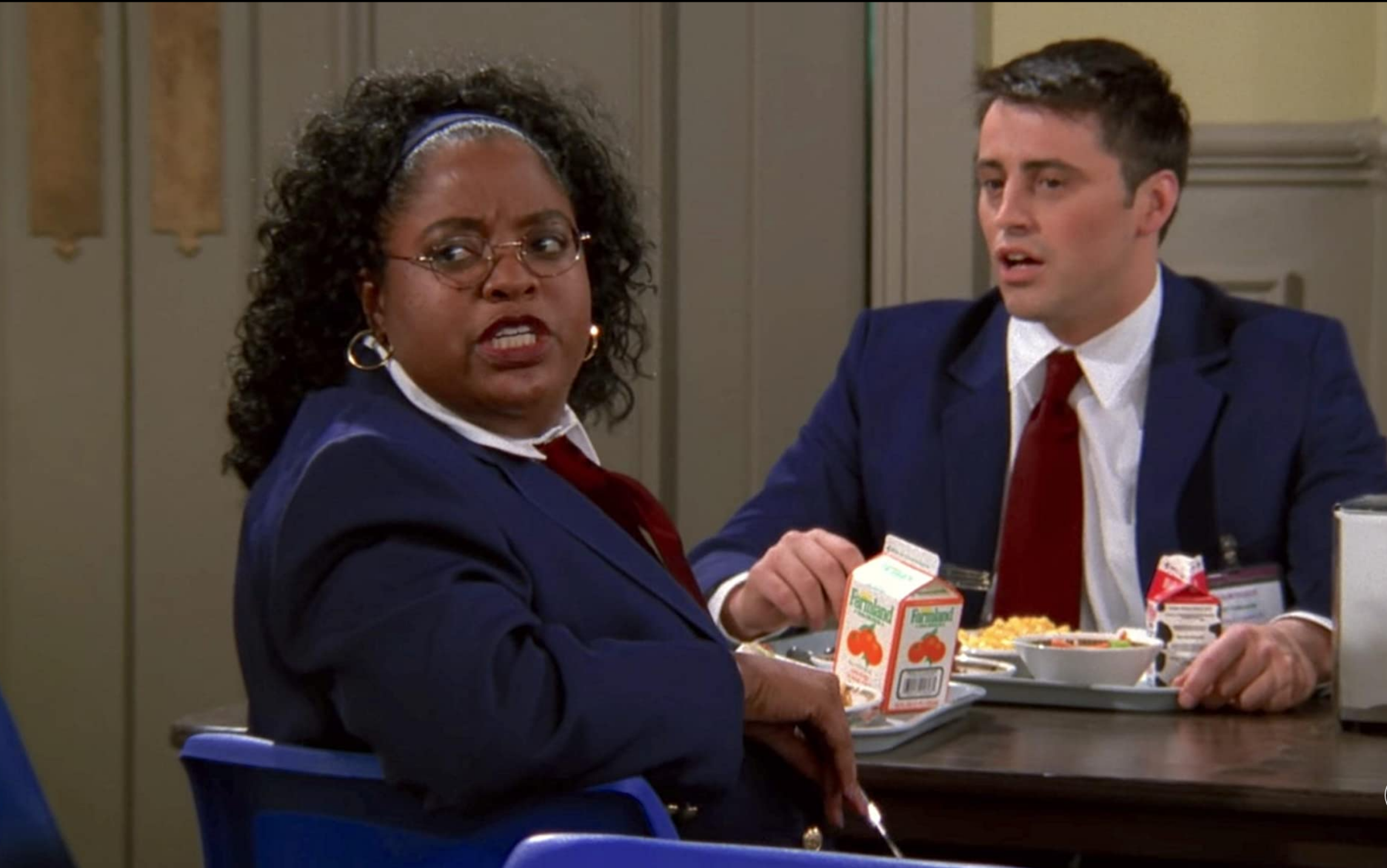 Oh, would you mind sitting there? I'm saving this seat for my friend, Ross. (블루 블레이저를 입은 여성이 자리에 앉으려자 로스를 위해 남겨놨다고 이야기하는 로스)