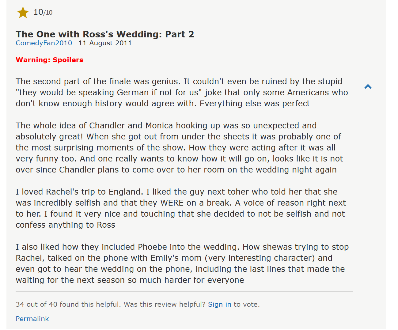챈들러와 모니카는 하룻밤을 같이 보내고, 서로 미쳤다고 얘기하면서도 다시 만날 계획을 잡습니다. 한편, 로스는 결혼식장에서 레이첼을 만나 반가워합니다. 레이첼은 막상 로스와 에밀리의 모습을 보면서 자신의 마음을 전달하는 대신에 축하인사를 전합니다. 그리고 로스는 서약을 할 때 에밀리의 이름대신에 레이첼의 이름을 내뱉습니다.