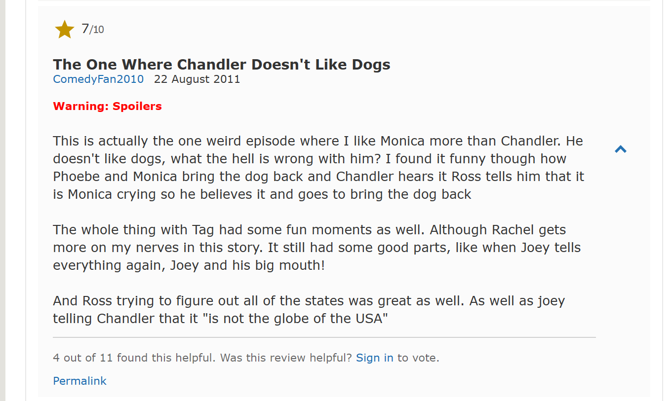 챈들러는 친구들에게 제한 시간 안에 미국의 50개 주의 이름을 쓰는 게임을 권유합니다. 로스는 이까짓거 껌이라는 태도로 달려들었다가 46개 밖에 쓰지 못하고, 그날 내내 생각나지 않는 이름을 떠올리며 밥도 안먹고 게임이 매달립니다. 피비는 잠시 여행간 친구의 개를 맡아 주면서 모니카의 집에서 몰래 보호하고 있었는데요. 챈들러는 개 알러지가 있다며 극성입니다.