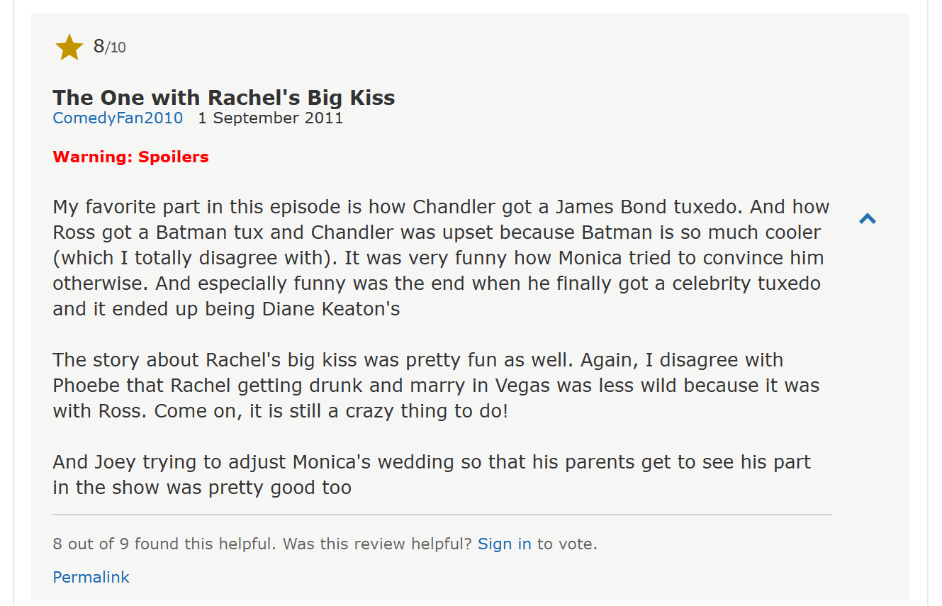 Rachel runs into Melissa (Winona Ryder), a former sorority sister with whom she once had a passionate kiss. However, Melissa denies it ever happened. Phoebe disbelieves that Rachel is capable of kissing a woman, so the latter recreates the kiss with surprising results: Melissa does remember and has feelings for Rachel. Meanwhile, Chandler is excited when he rents the same tuxedo that Pierce Brosnan had worn as James Bond, but feels outdone when Ross claims to have tried on the same tux that Val Kilmer had worn in Batman Forever. However, Ross’s tux turns out to be the one Val wore at a different movie.