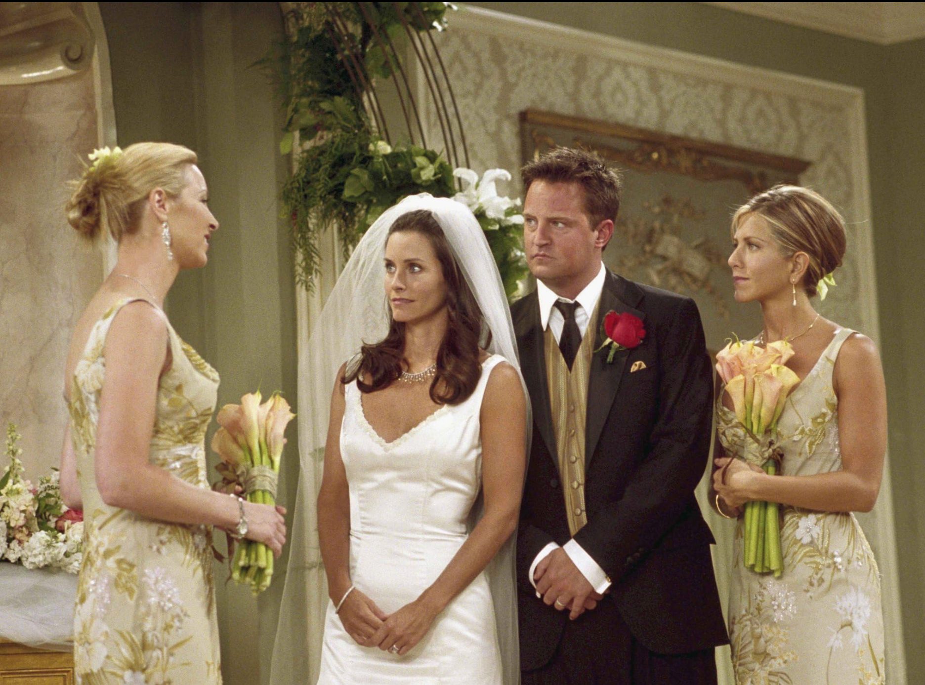 Everybody thinks Monica is pregnant, but her denial quickly shifts the focus to Phoebe, who claims she is pregnant to cover for Rachel, the one who is expecting. When Monica realizes it is Rachel, she and Phoebe have her take an additional test to confirm it. Phoebe initially says the new test is "negative" causing Rachel to be sad and disappointed by the different result. Phoebe then says it is positive and that Rachel now knows how she truly feels about having a baby. Chandler surprises Monica by having taken dance lessons for their wedding reception, but his slippery shoes leave him with two left feet. Joey tries to impress Mrs. Bing's date, a Broadway director. Ross meets a beautiful woman named Mona at the reception. He switches his seating number to her table, but mixing up the number, he ends up at the children's, then has to dance with the little girls, which impresses Mona.