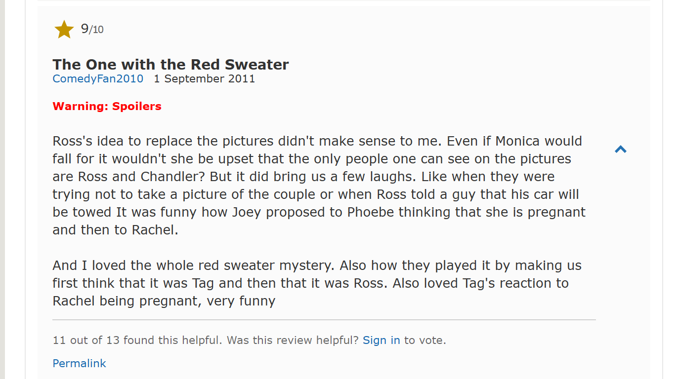 Rachel refuses to reveal who the baby's father is until after she tells him. Joey tells Monica and Phoebe about an unknown guy who slept with Rachel a few weeks earlier and who left a red sweater behind. Phoebe thinks it is Tag Jones' sweater and arranges a meeting between him and Rachel. Ross and Chandler attempt to recreate the wedding reception pictures, after Chandler loses the disposable cameras. Monica opens all the wedding presents without waiting for Chandler. Monica, Joey, and Phoebe learn that Tag is not the father of Rachel's baby. As they are still pondering the mystery, Ross arrives and retrieves his "lost" red sweater, unaware of its significance.