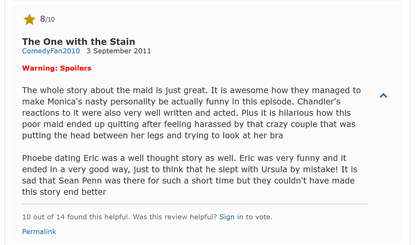 Chandler hires a maid to help Monica, but she soon suspects the maid is stealing her clothes. After getting Chandler to inspect a pair of jeans she is wearing that she thinks are hers, Rachel returns Monica's borrowed clothes. The maid quits, believing Chandler is a pervert. Eric wants to date Phoebe, but he is too reminded of Ursula. Ross attempts to secure the apartment of a dying Dutch woman for Rachel, while Joey wants Rachel to continue living with him.