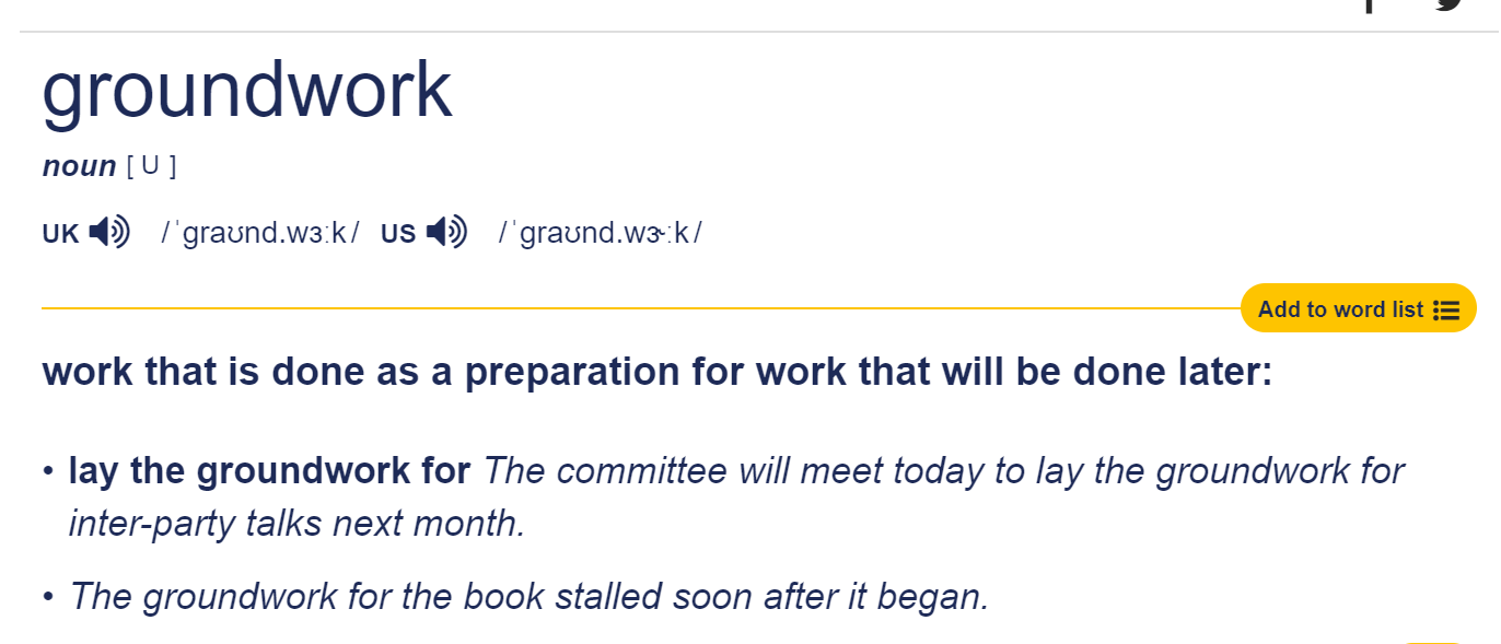 조선일보 [스피킹이 강해지는 영어]에서 해당 표현을 잘 정리한 내용을 찾아서 설명을 옮겨보겠습니다. "일반적으로 중요한 일을 시작할 때 성공적으로 마무리하기 위해 기초 작업을 하게 된다. 이처럼 개인적인 일이나 프로젝트 같은 일을 성공하기 위해 토대를 마련한다는 의미로 쓴다"