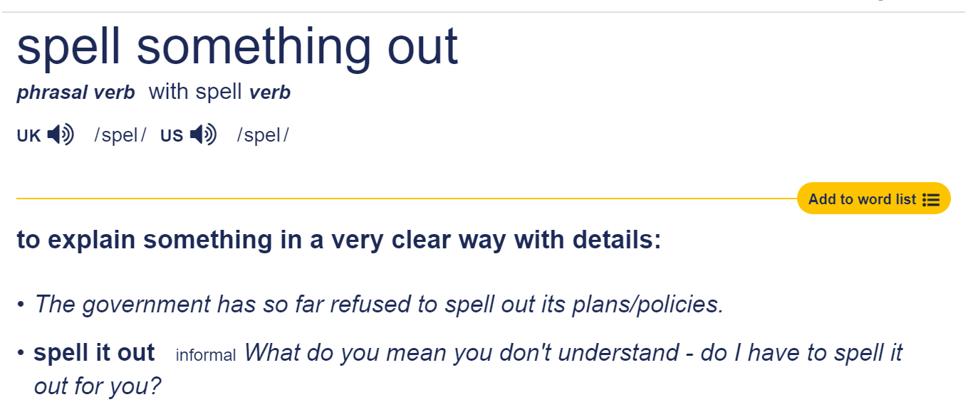 네이버 어학사전에서 검색해 보면 '~을 간결하게(자세히) 설명하다'로 표현이 됩니다. 예시를 볼까요. Don't make me spell this out for you. Let me spell out what I have in mind. Spell이란 동사가 철자를 말하다(쓰다)라는 뜻이고 여기서 '자세히 설명하다'의 의미로 발전한 것이라고 합니다. 비슷한 뜻의 단어로는 명확하게 하다, 분명히 말하다의 'Clarify'를 들 수 있습니다. Clarify: to make something clear or easier to understand by giving more details or a simpler explanation. 예를 들어, Let me just clarify what I mean here.