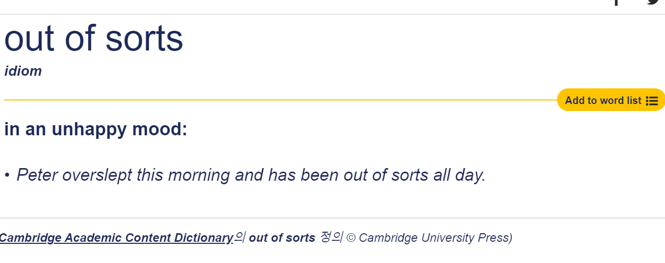 네이버 어학사전에서 검색해 보면 '몸이 불편한, 기분이 언짢은'으로 해석하고있습니다. 예시를 볼까요. She was tired and out of sorts by the time she arrived home. He felt out of sorts all day. or He was in a bad temper [humor] all day. 레이첼이 'I feel blue'라고 하면서 우울해하던 장면도 떠오르는데요. 기분이 울적하다는 의미로 해석이 됩니다.
