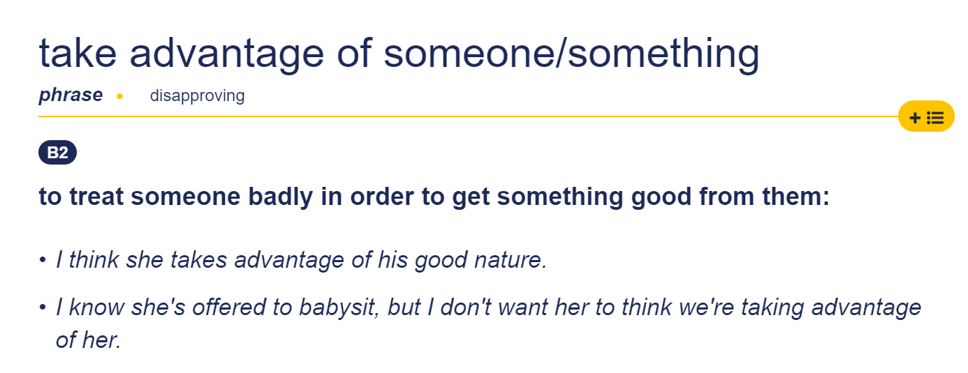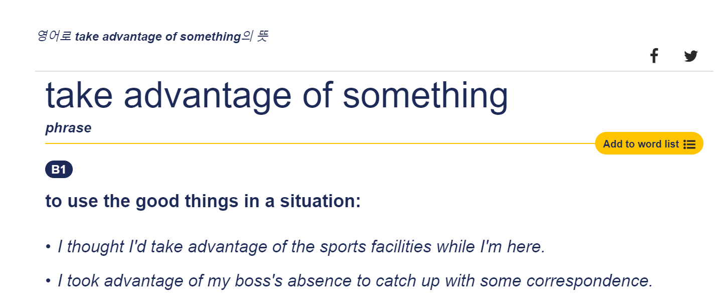 네이버 어학사전에서 검색해 보면 ' ~을 이용하다, ~을 기회로 활용하다', '~을 이용해 먹다, 악용하다 (=exploit)' 이렇게 두 가지 의미로 해석이 됩니다. 예시를 볼까요. You should take advantage of it. 당신은 그것을 이용해야 합니다. Use me. I'll let you take advantage of me. 날 이용해요. 이용당해 주겠소.
