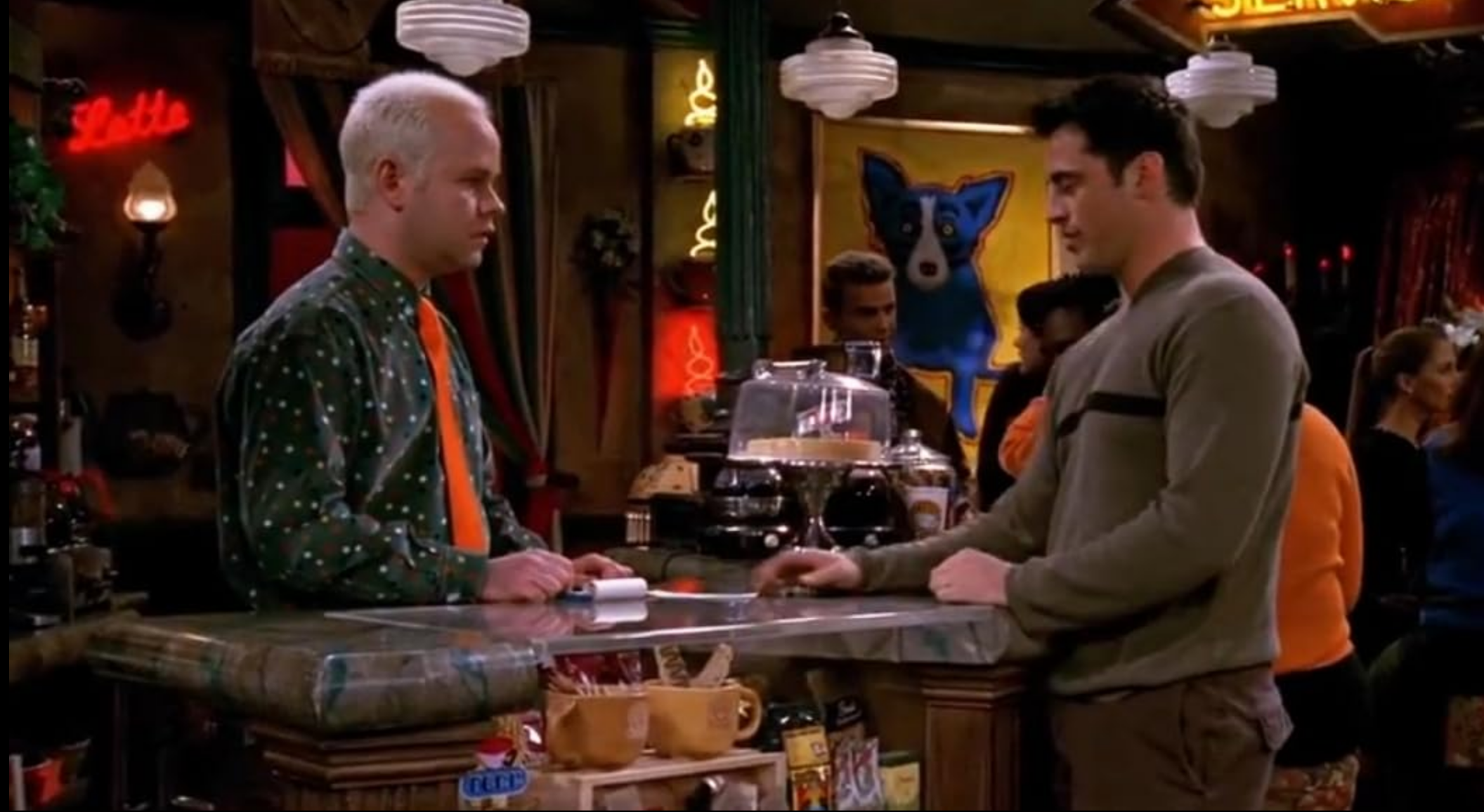 로스의 조크가 플레이보이지에 실리고, 챈들러는 그 조크를 읽더니 자신이 원조라며 성을 냅니다. 누가 그 조크의 원조인지 챈들러와 로스는 쟁탈전을 벌입니다. 친구들과 커피하우스에서 어울리던 조이는 건터로부터 계산서를 받게 되지만, 지금은 일하지 않아 돈이 없다면서 못 낸다고 얘기를 꺼냅니다. 그러자 건터가 조이만 괜찮다면 여기서 일해도 된다고 제안하죠. 조이는 자신이 드라마에 출연한 유명인이기도 하고, 친구들에게 서비스를 제공하는 것이 민망하다며 거절하지만 보수도 만족스럽고 근무시간도 자유롭다는 얘기를 듣고 솔깃합니다.